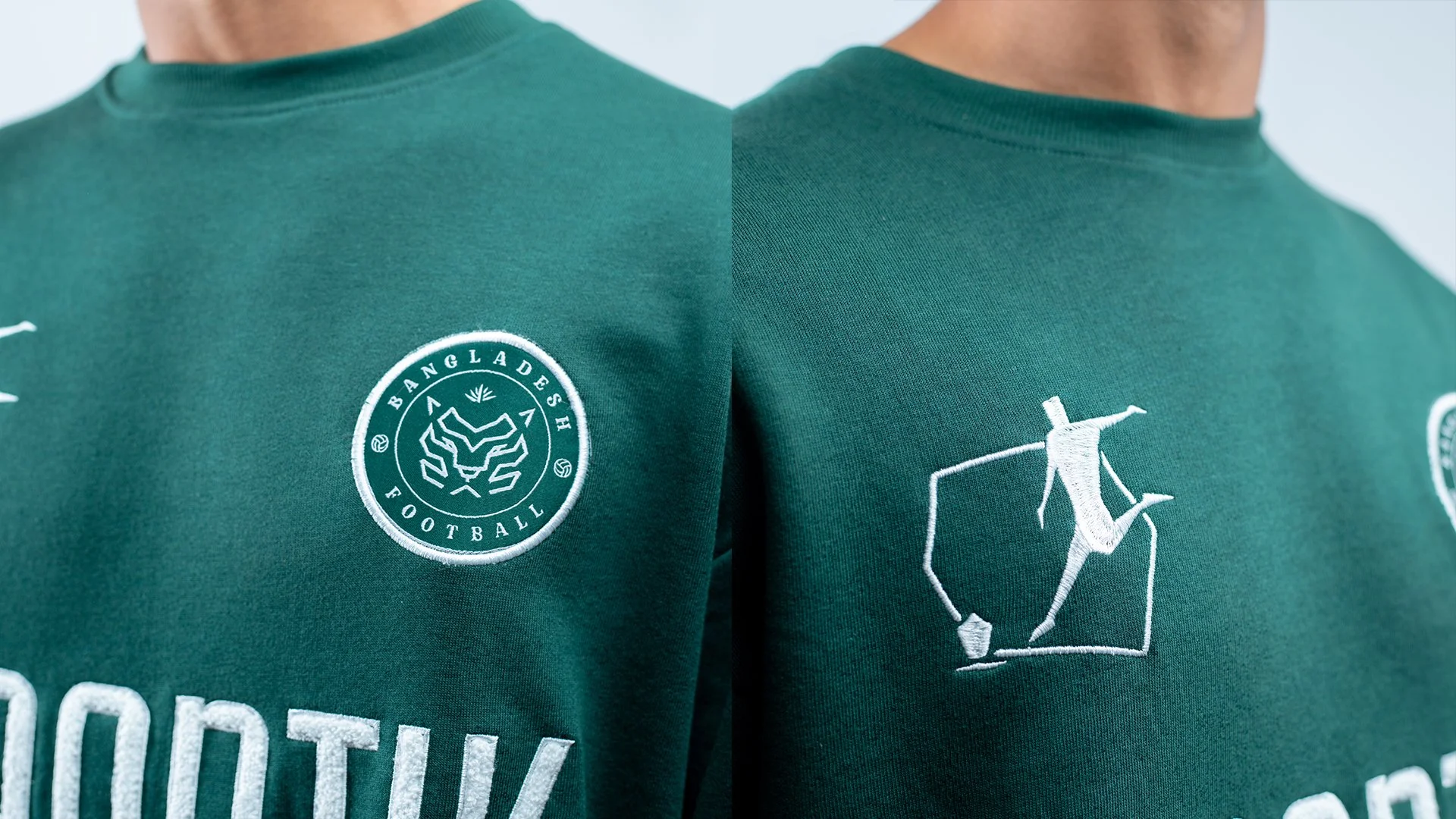 The design is based on vintage sweatshirt patterns, whilst taking inspiration from the green and white colourways of Bangladesh football kits.